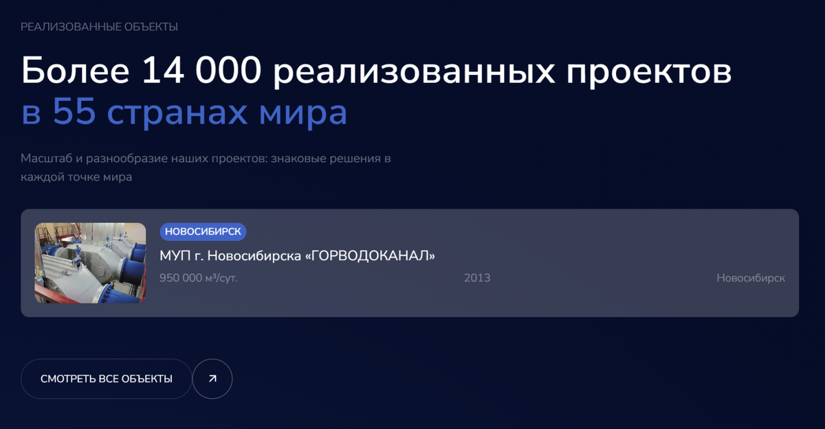 🔻 Отдельно стоит отметить, что даже в очень минималистичном формате с указанием основных цифр о клиентах, их географии, размерах компаний и др. такой блок поможет нам подчеркнуть свой опыт и выделиться на фоне других производителей: